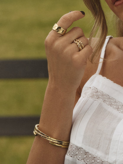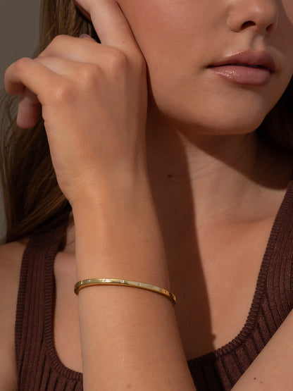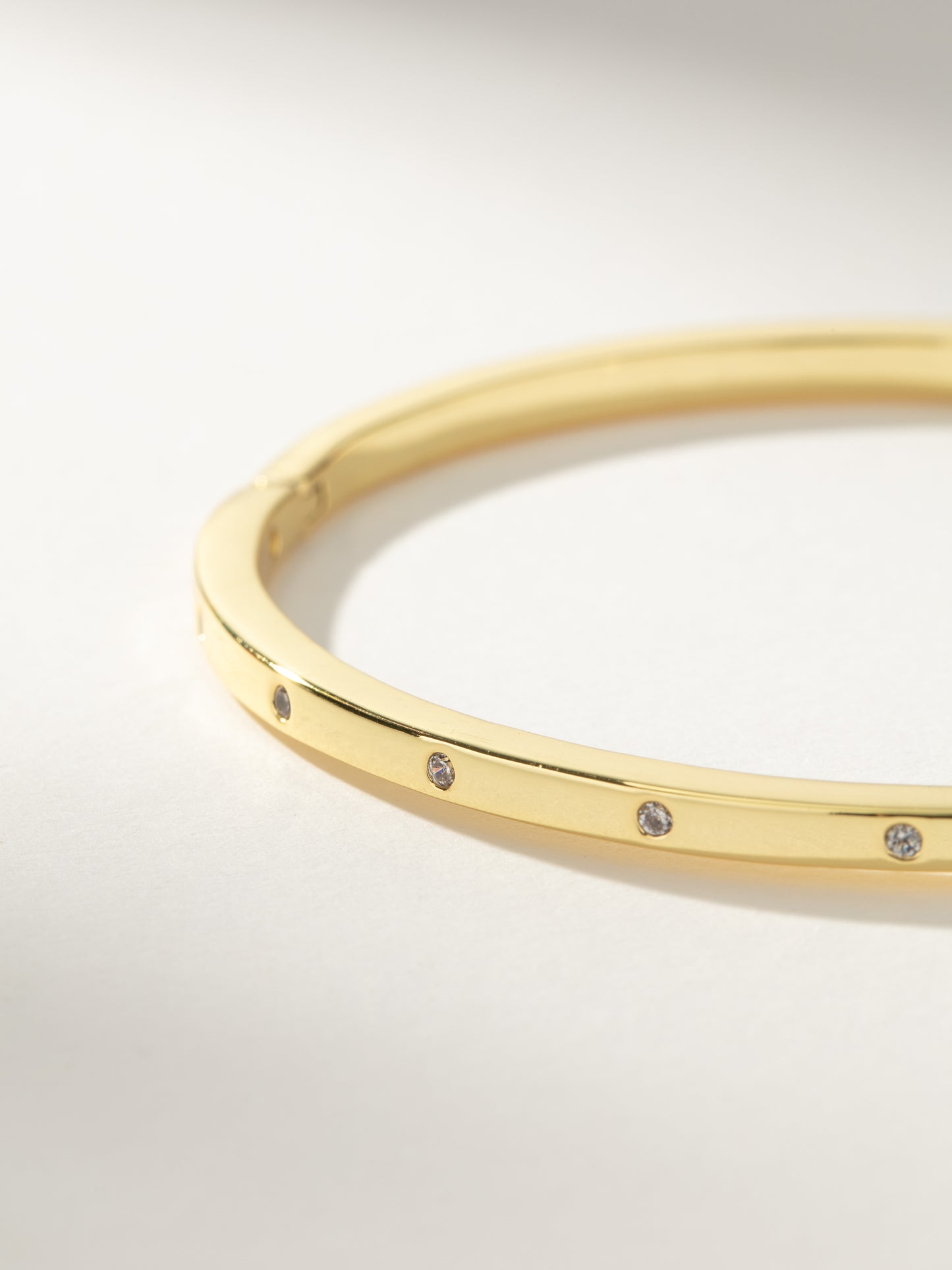 The classiest bracelet you’ve ever met. Our First Class Bracelet is a simple gold bangle with cubic zirconia stones for a touch of shine. Simple enough to wear every day and also perfect for layering with all of your other bangle bracelets.