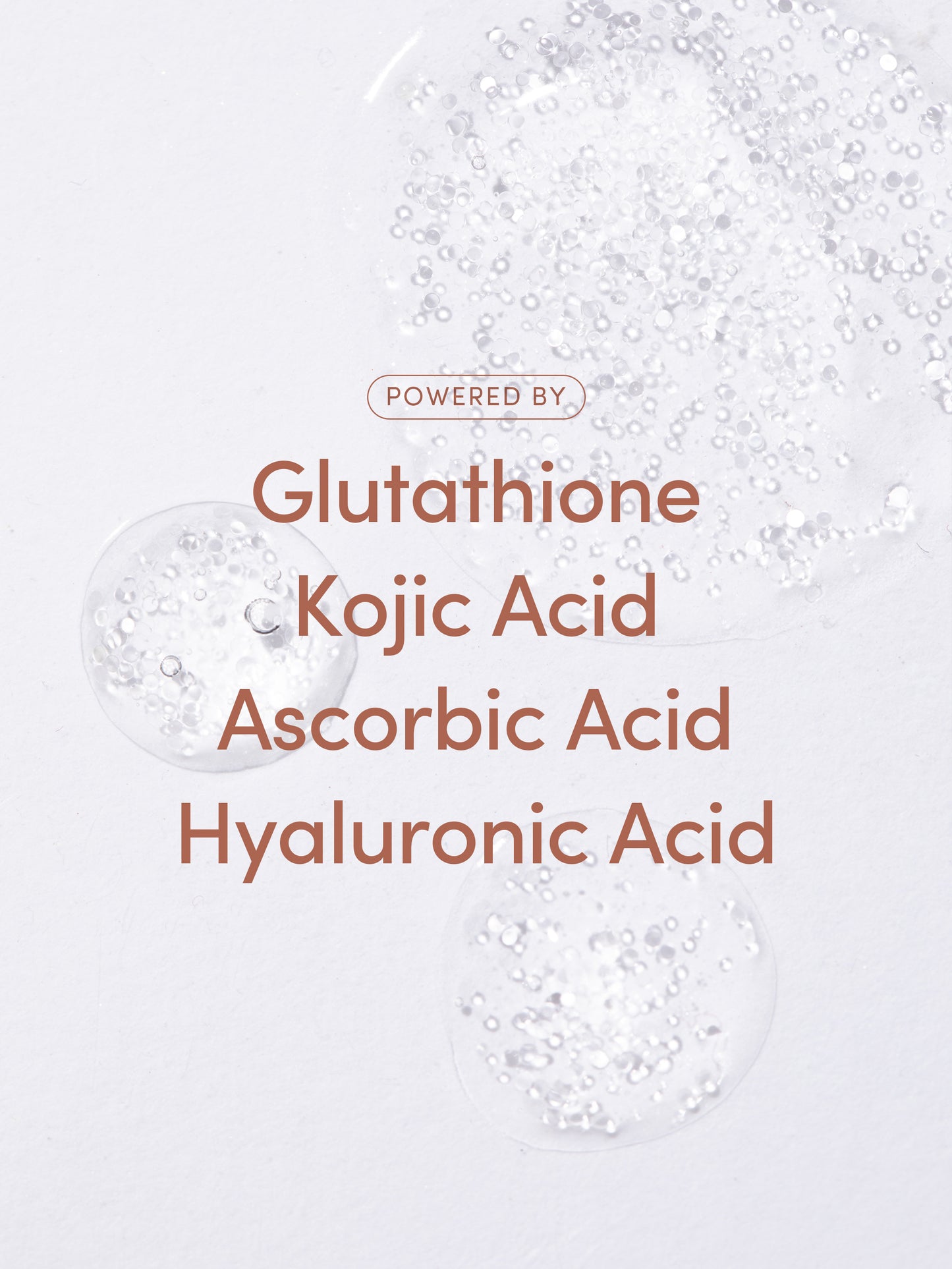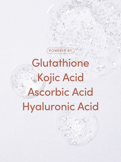 Water (Aqua), Propanediol, Glycerin, 1,2-Hexanediol, Caprylyl Glycol, Sodium Hyaluronate, Sorbitan Oleate Decylglucoside Crosspolymer, Tetrasodium Glutamate Diacetate, Ascorbic Acid, Pyrus Malus (Apple) Fruit Extract, Glutathione, Citric Acid, Kojic Acid, Sodium Hydroxide, Vanilla Planifolia Fruit Extract, Ananas Sativus (Pineapple) Fruit Extract, Citrus Aurantium Dulcis (Orange) Fruit Extract, Citrus Limon (Lemon) Peel Extract, Eugenia Caryophyllus (Clove) Flower Extract, Salvia Officinalis (Sage) Leaf Extract, Oxidized Glutathione, Rosa Canina Fruit Oil, Tocopheryl Acetate, Vitis Vinifera (Grape) Seed Oil