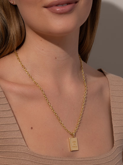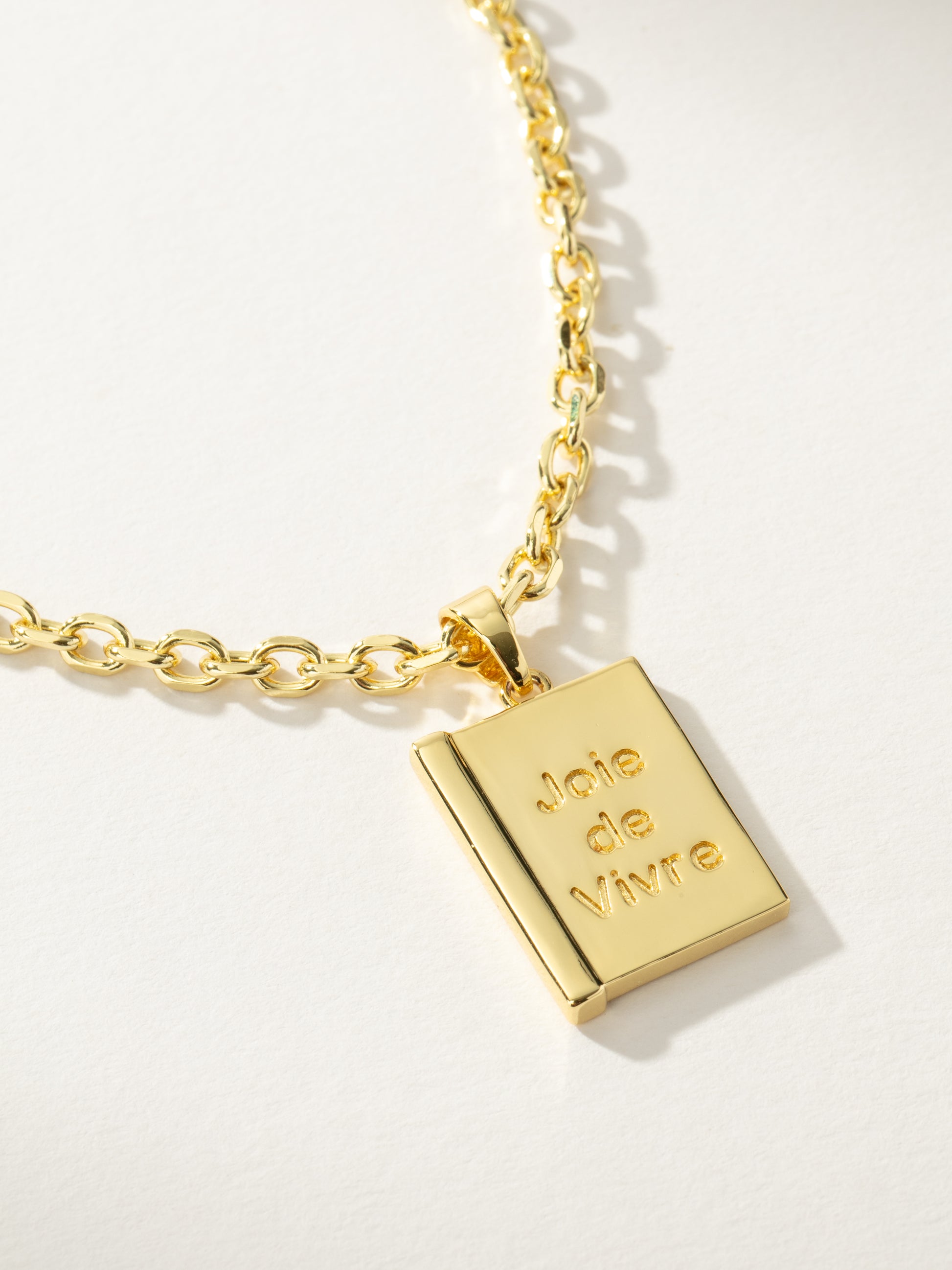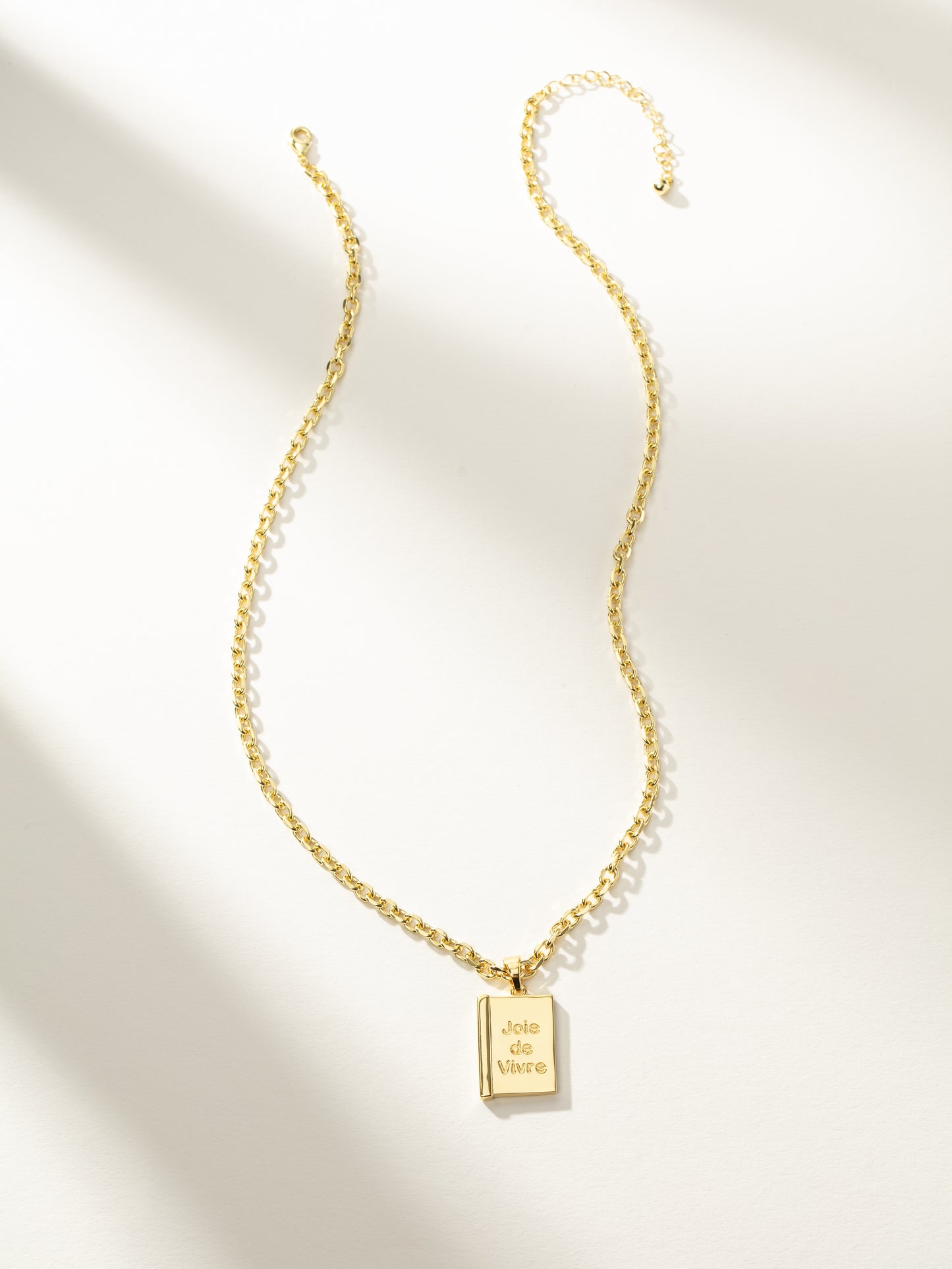 Experience the joy of living every time you wear this necklace. The Joyous Pendant Necklace is crafted from an everyday gold chain and a book-shaped pendant that reads “joie de vivre” (a.k.a. “joy of living” in French). When stacking this gold necklace, our stylists like to layer with short dainty necklaces.
