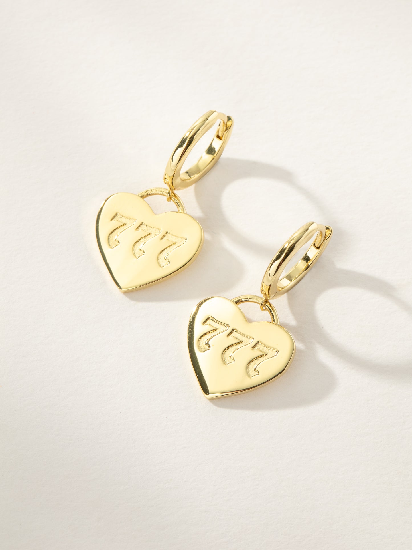 It’s your lucky day, you just found your new favorite gold earrings. Our Lucky Girl Huggie Earrings are crafted from a small gold hoop and a heart dangle that features our favorite angel number, 777. Wear these with your other Uncommon James earrings. P.S. in case you missed the signs, 777 means luck and that good things are coming your way.