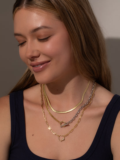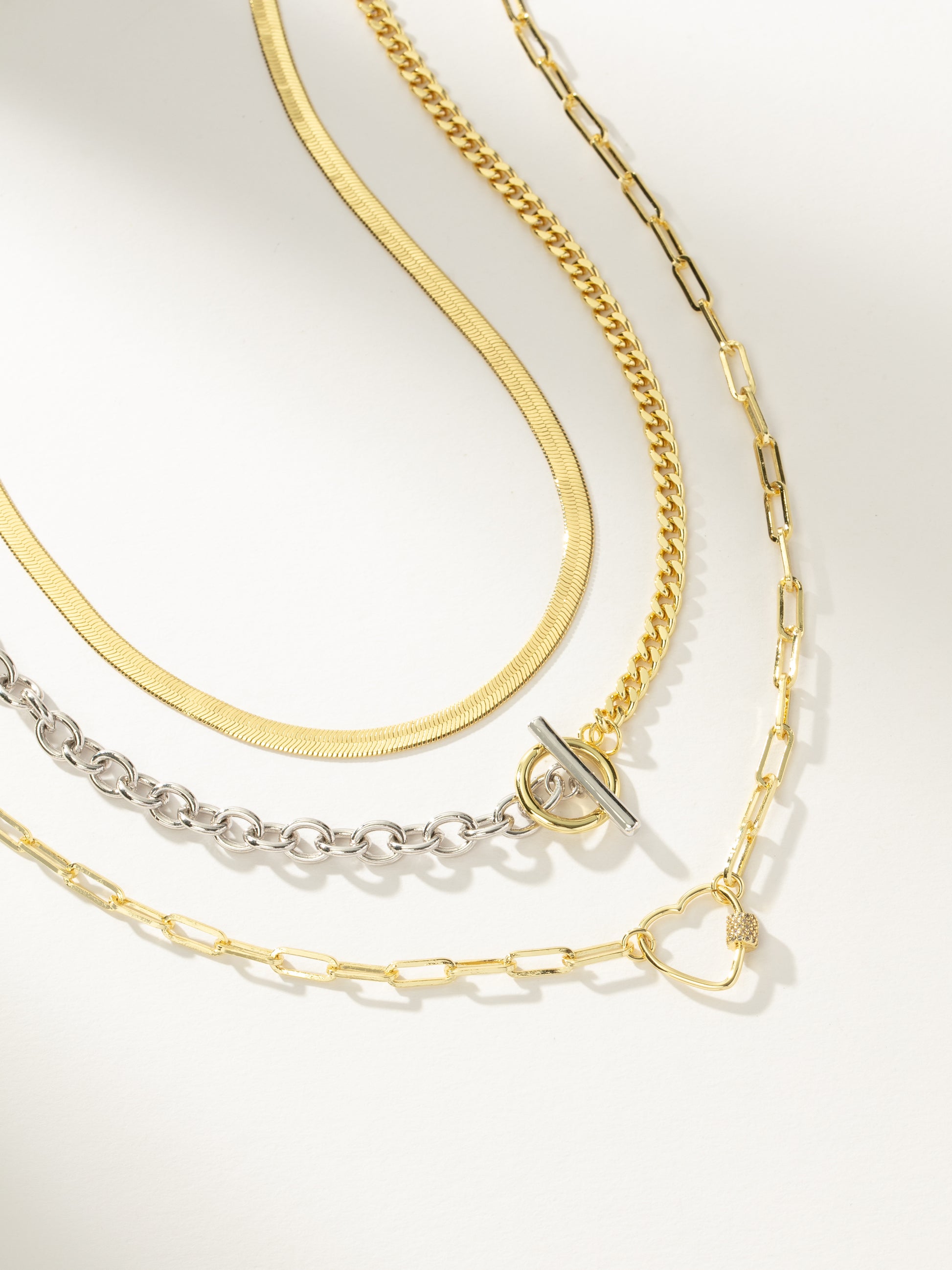This layered necklace set is dedicated to all of our mixed metal lovers. Featuring our best-selling gold herringbone chain necklace, a locked heart chain necklace, and of course an iconic mixed metal chain necklace. Wear all three necklaces together for a mixed metals look and mix and match with the other gold and silver necklaces in your jewelry collection. Want more pre-styled jewelry sets like our Mixed Metal Lover Necklace Stack? Check out all of our Signature Sets.