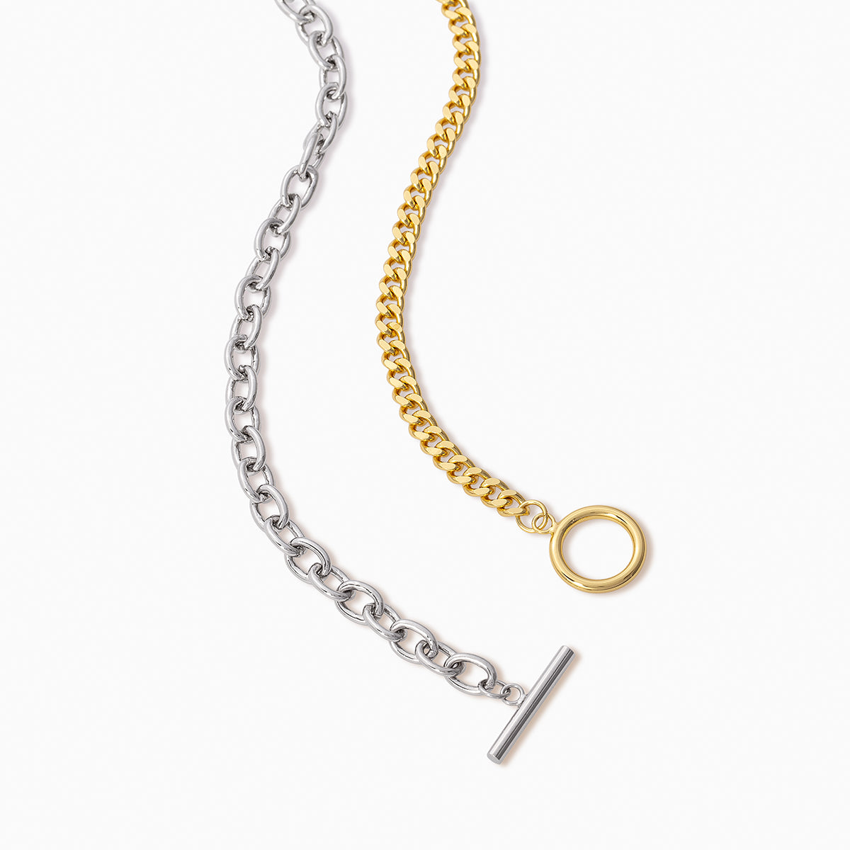 Our unisex Mixed Metal Chain Necklace is the perfect gold and silver chain necklace. Half gold curb chain, half silver cable chain, this mixed metals necklace is the best way to mix silver and gold jewelry. Get Kristin’s full look when you pair this chain necklace with our Mixed Up Ring and a statement chain necklace. Made to pair with all UJ charms.