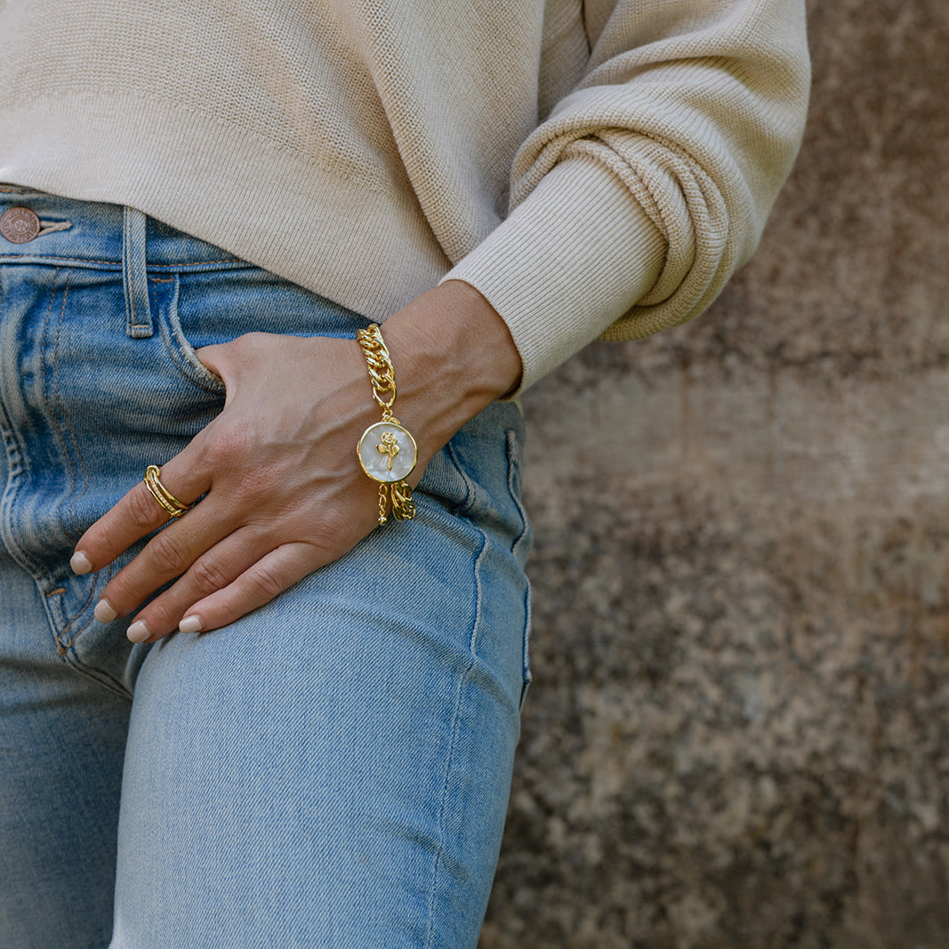 A chunky chain bracelet meets a mother of pearl inspired rose pendant to create our Pearlescent Rose Bracelet. For a full look, pair this gold bracelet with our Pearlescent Rose Ring.